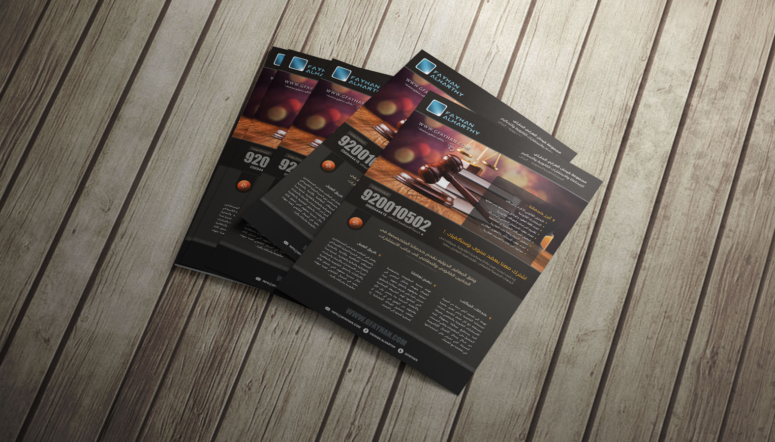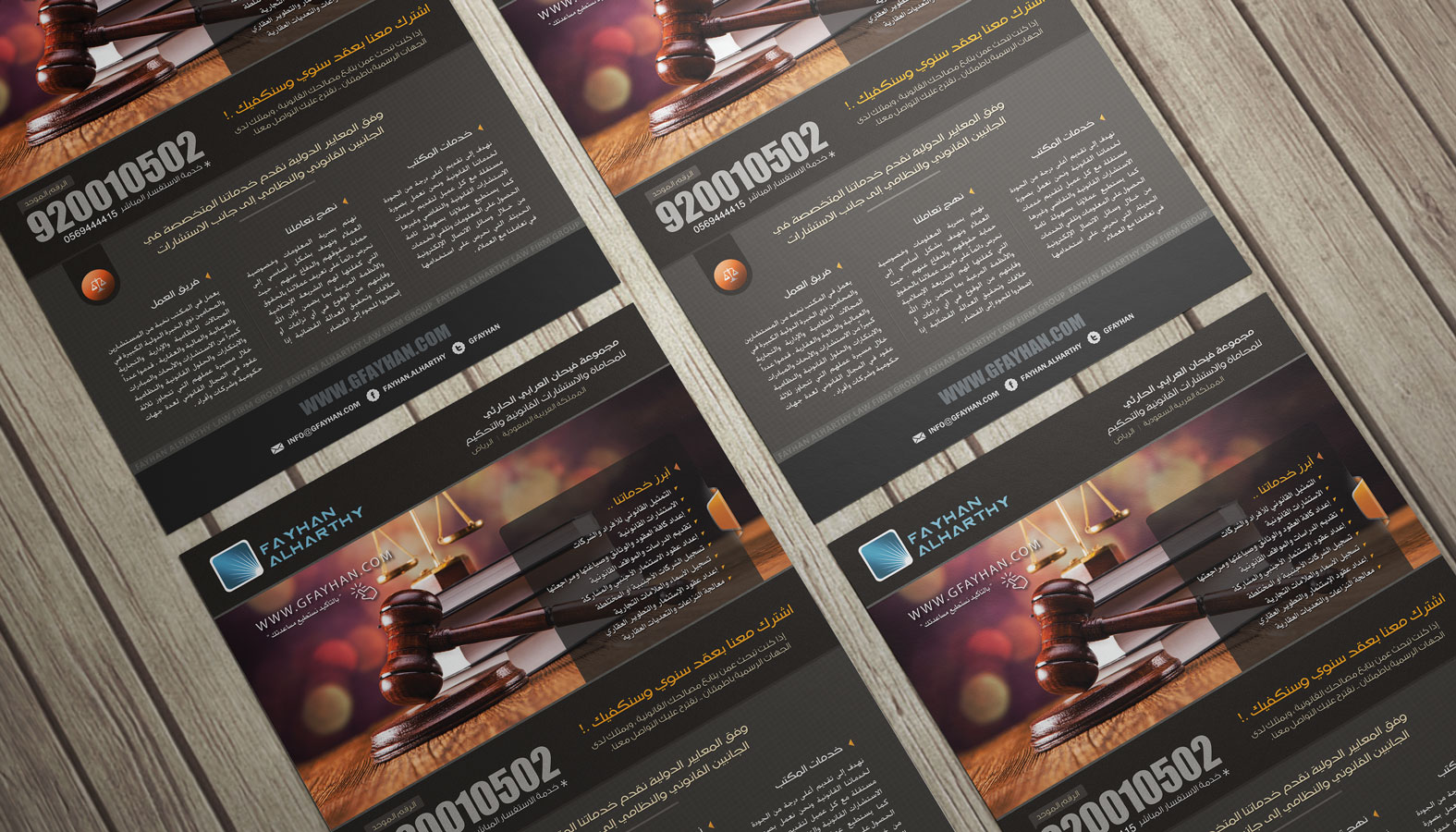 تصميم فلير تعريفي لـ مجموعة فيحان العرابي الحارثي للمحاماة والاستشارات القانونية والتحكيم. التصميم مهيئ للطباعة بنظام الوان CMYK و RGB لاستخدامات الويب.