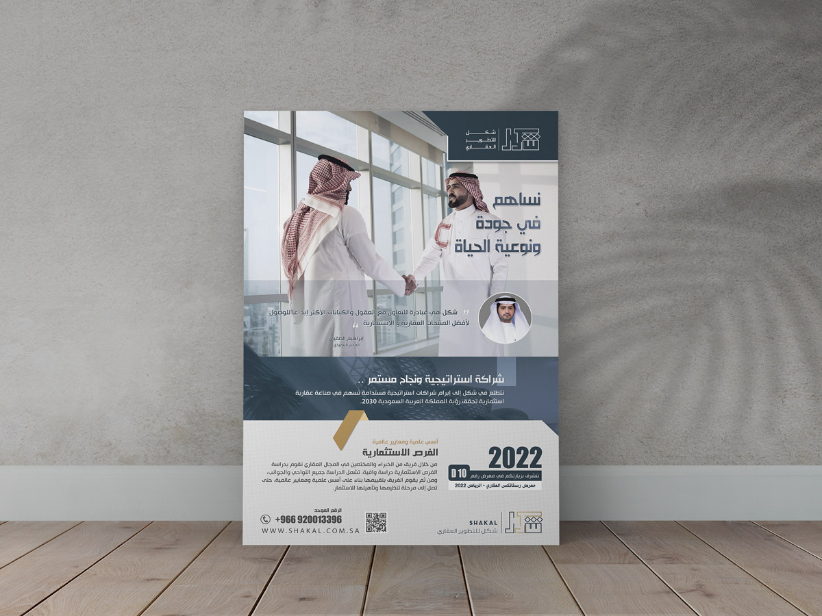 تصميم فلير تعريفي لصالح شركة شكل للتطوير العقاري، حيث تم العمل على التصميم ليتناسب مع مشاركة العميل في معرض رستاتكس العقاري 2022 – الرياض. التصميم مهيئ للطباعة بنظام الوان CMYK و RGP لاستخدامات الويب.