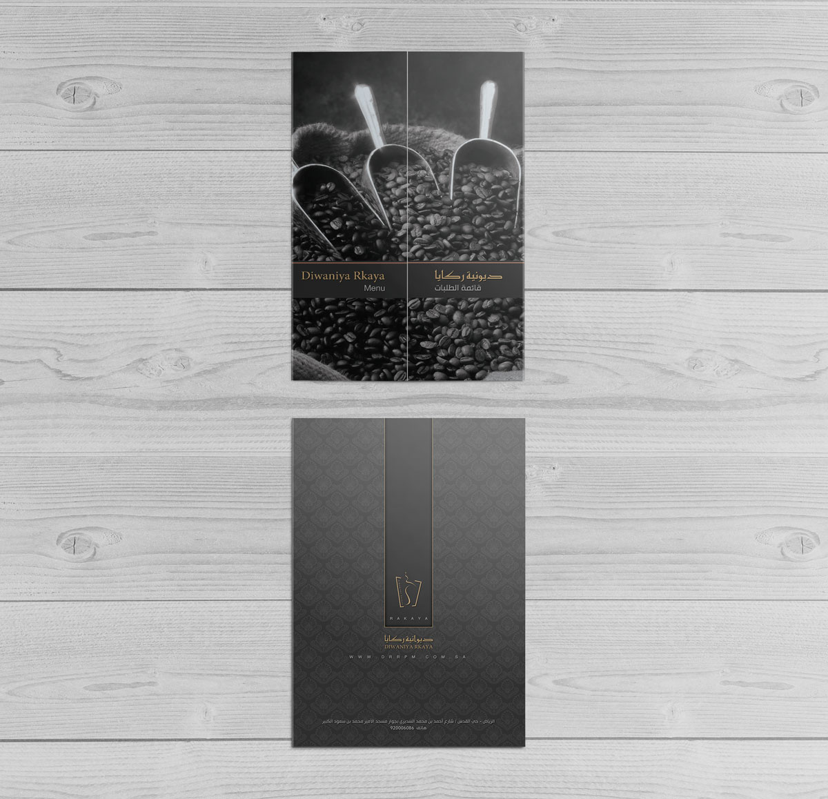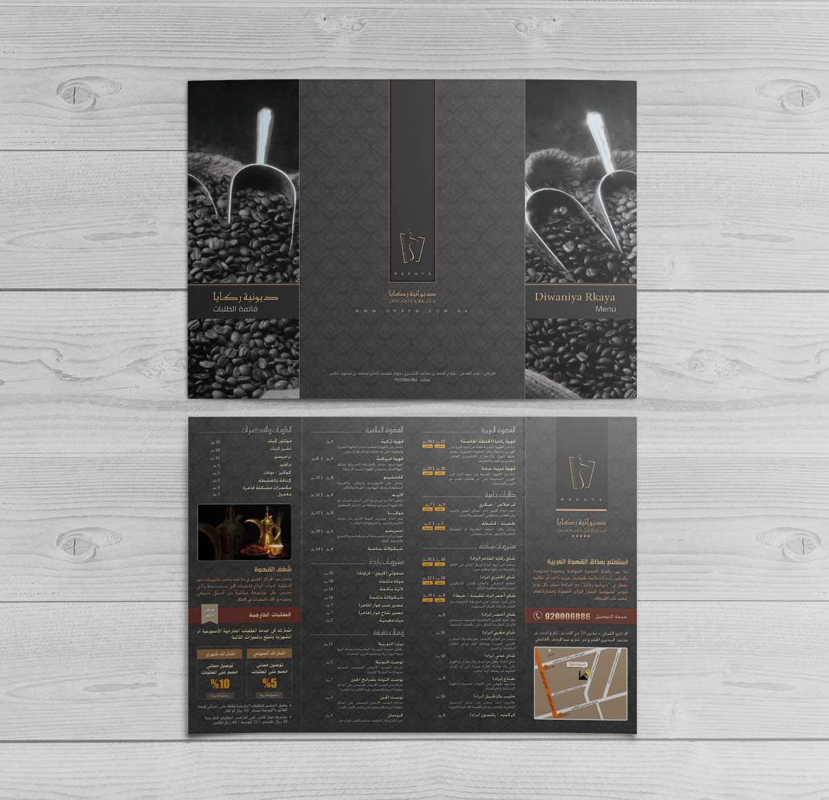 تصميم قائمة طلبات – Menu لـ مقهى ديوانية ركايا (مقهى عربي). القائمة عنصر من مجموعة عناصر تضمنتها باقة مطبوعات هوية تجارية خاصة بنشاط العميل.